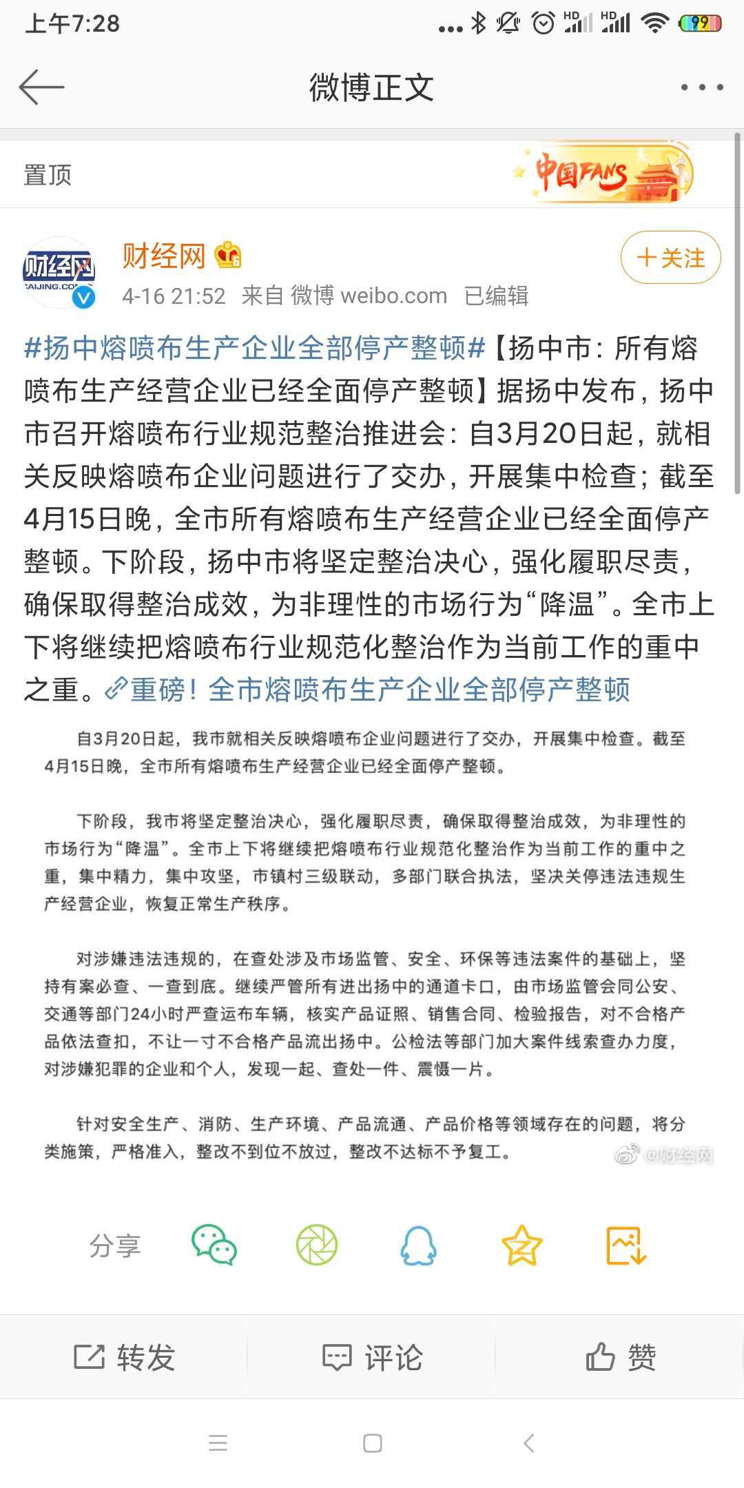 4月15日,经扬中市委、市政府研究决定,在全市范围内实行熔喷布行业“休克”疗法,熔喷布生产企业、个体工商户一律停产整顿,直至产品符合相关质量标准、生产环境设施满足安全环保要求,再经审批方可重新开工,对经审查无法整顿到位或不具备生产经营条件的,坚决予以关停、取缔。凯时尊龙官网网址风机从客户处得知,整顿的消息出来后,个别小作坊已经开始甩卖生产线了,还有的开始向内地转移生产线,但暴利之下,只能让市场来调节,整顿产量下来了,可能会出现越整顿越涨价的情况。