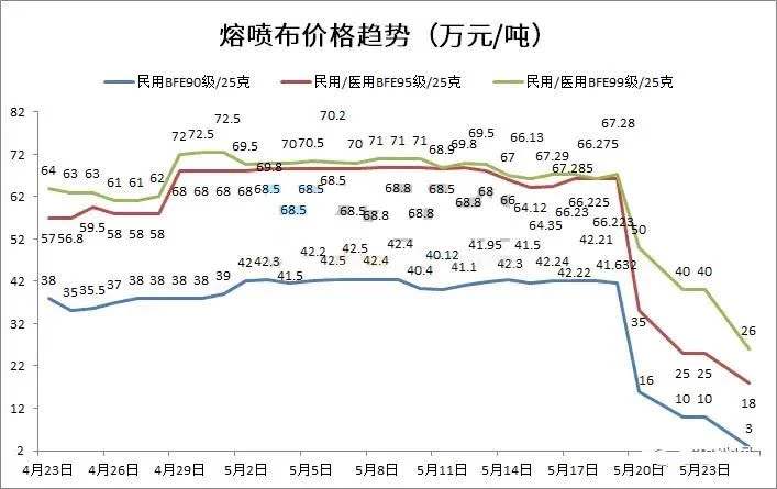 随着疫情逐渐地稳定,随着越来多的企业想分一杯羹,熔喷布很快就出现了供过于求,如果这些作坊生产出来的熔喷布做成口罩流向国际市场,会严重影响国家商誉,对商家和国家都没有好处。再加上国内熔喷布审查标准变严格,大部分不合格的熔喷布被退货,导致了这次熔喷布价格的暴跌。
