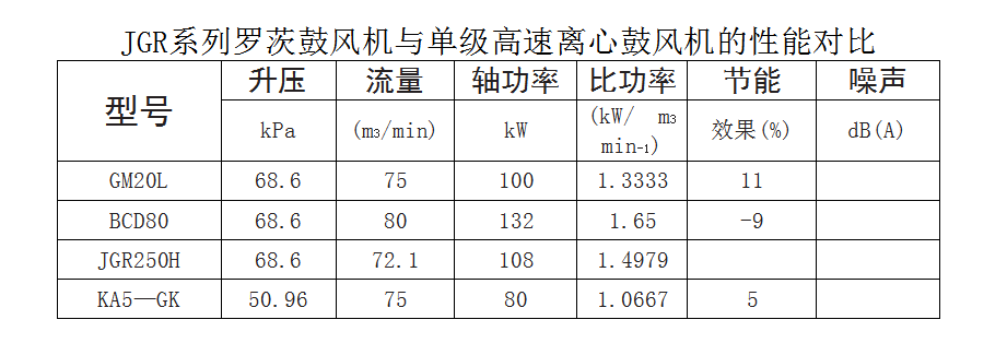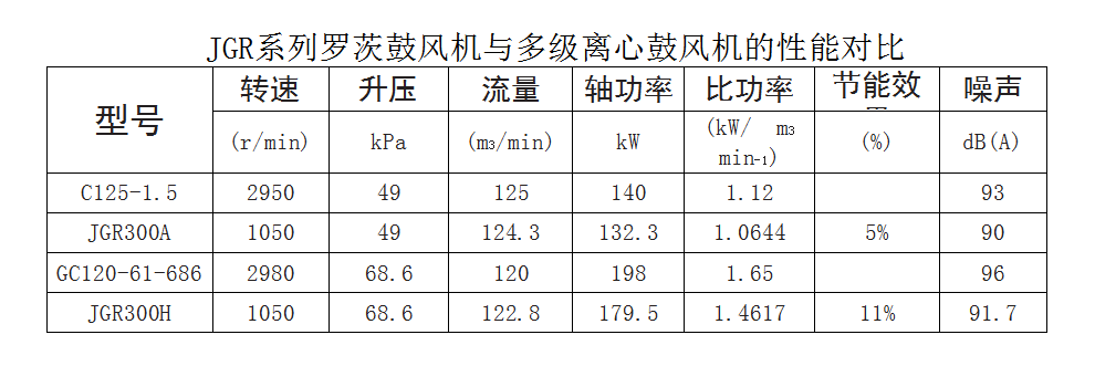 (2)JGR系列罗茨鼓风机与单级高速离心鼓风机能耗比较:
