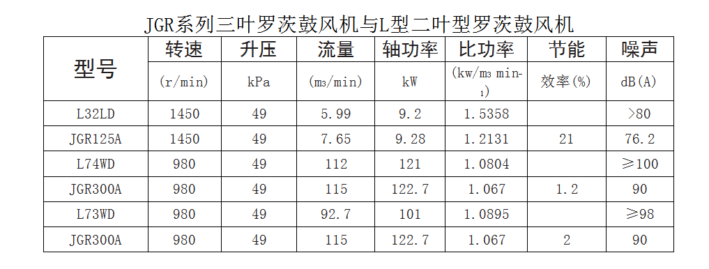 (3)JGR三叶罗茨鼓风机与L型二叶型罗茨鼓风机及国外三叶型罗茨鼓风机的性能对比:L型二叶罗茨鼓风机是80年代中期,当时的机械工业部组织全国几家重点罗茨鼓风机生产厂家联合设计的节能产品,列入国家第八批节能产品目录,JGR型三叶罗茨鼓风机是山东凯时尊龙官网网址有限公司自主研发的产品,两种产品的性能对比如下表。