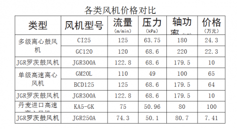 各类风机价格对比如上表所示。从上表可看出JGR系列三叶型罗茨鼓风机的价格是多级离心鼓风机的1/2不到;是国产单级高速离心鼓风机的1/5不到;是进口单级高速离心鼓风机的1/12不到,因而在价格上JGR系列罗茨鼓风机有绝对的优势。