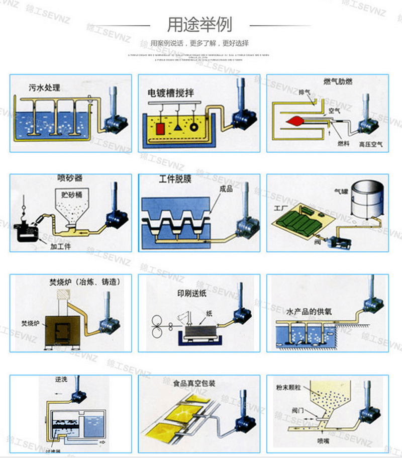 12、罗茨风机用途之加湿装置,用途之供给为稳定室内温度加湿装置和防止发生纺织、香烟及印刷等工厂静电气源。